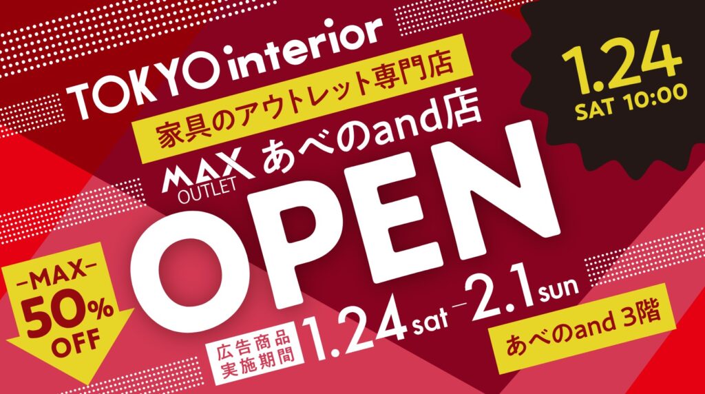 保護中: 【1/24大阪・阿倍野】全品アウトレット価格!東京インテリア「MAXあべのand店」期間限定オープン